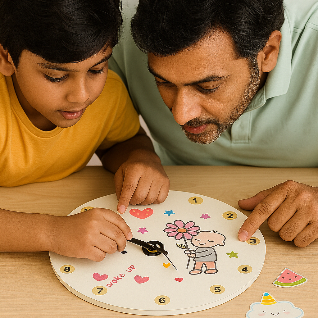 A functional and decorative clock featuring a cheerful design, completed by assembling movable hands and a custom illustrated face.